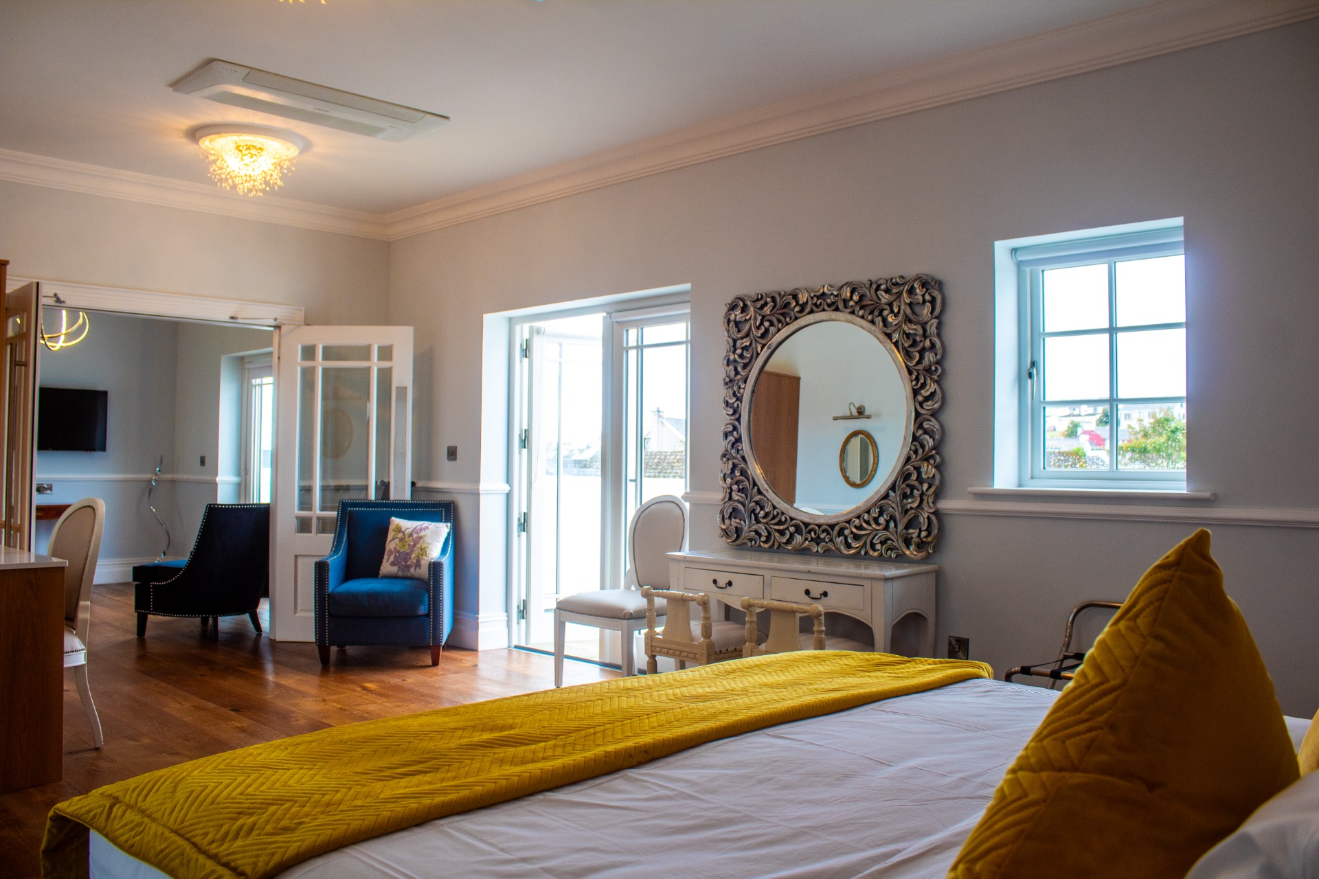 This impressive suite features a spacious master bedroom alongside a separate lounge with TV, giving you room to unwind and enjoy your stay at your own pace. A welcoming hall sets the tone, leading to the hotel's largest and most luxurious suite, while a private balcony, accessible from both the bedroom and lounge, offers a quiet spot to step outside.