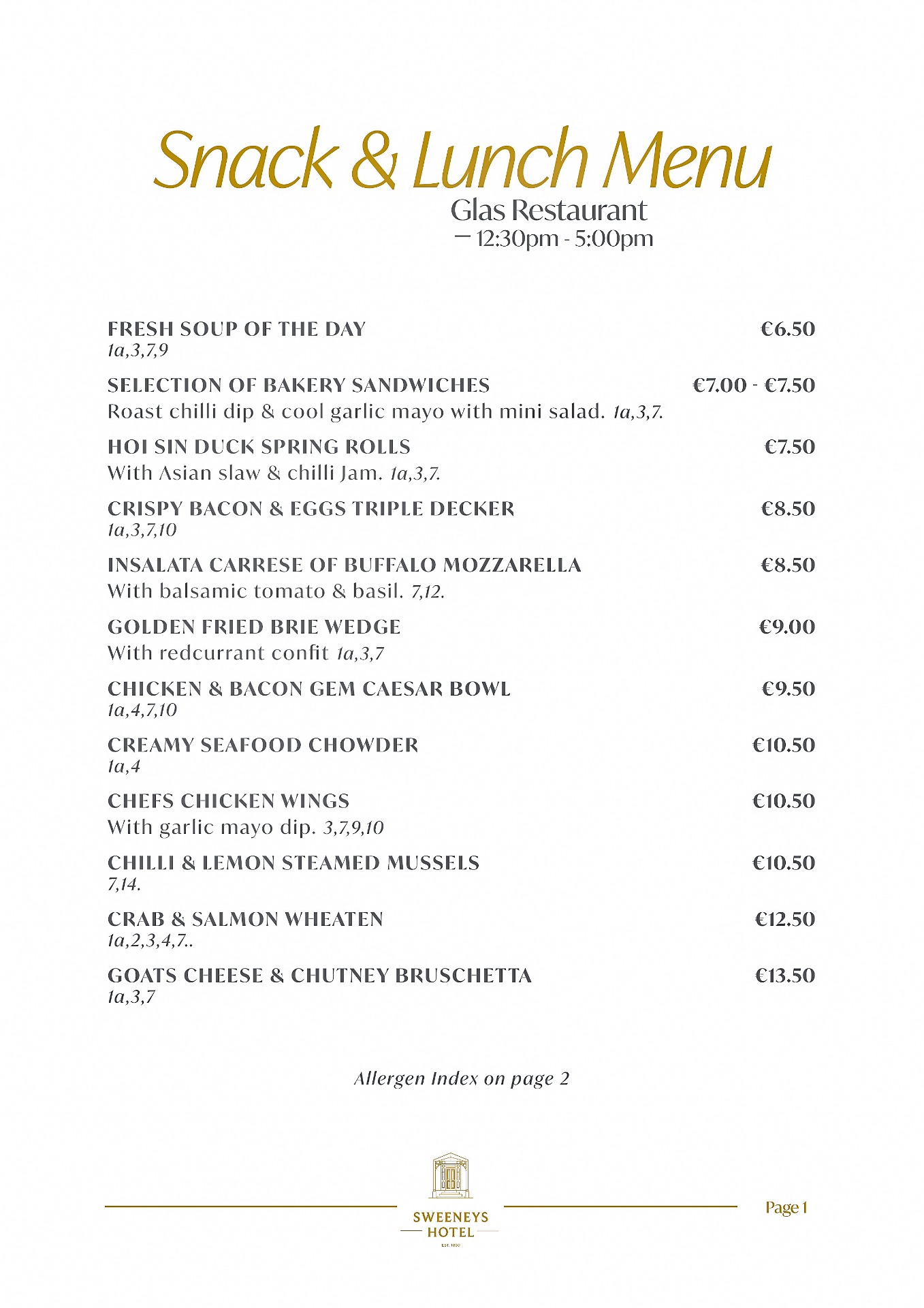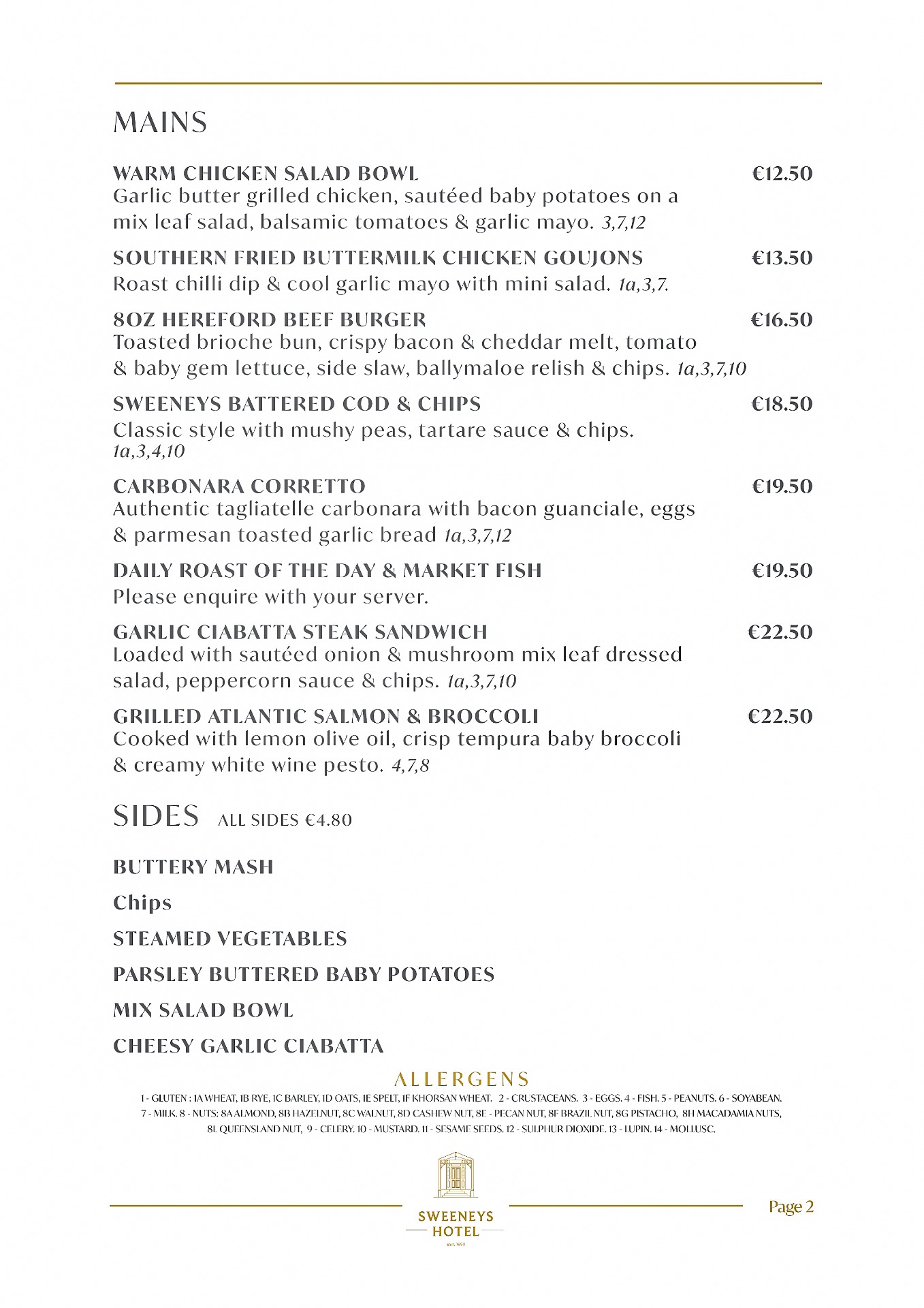 Available daily from 12:20pm to 5, our Snacks & Lunch Menu, offers comforting favourites & lighter bites, perfect for a casual midday meal. Menu also available in PJ's Saloon Bar & the Courtyard at Sweeneys.