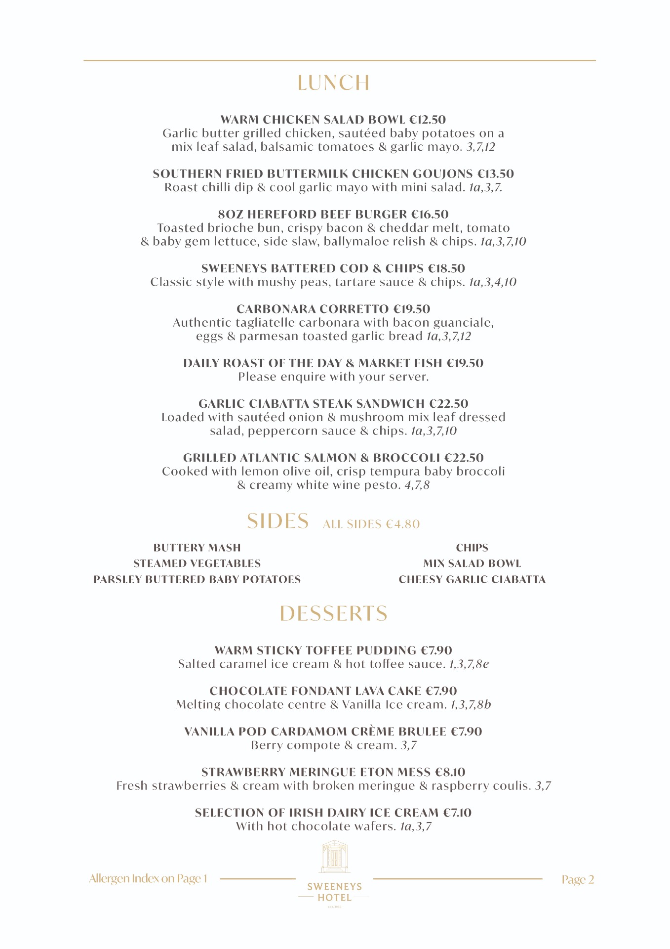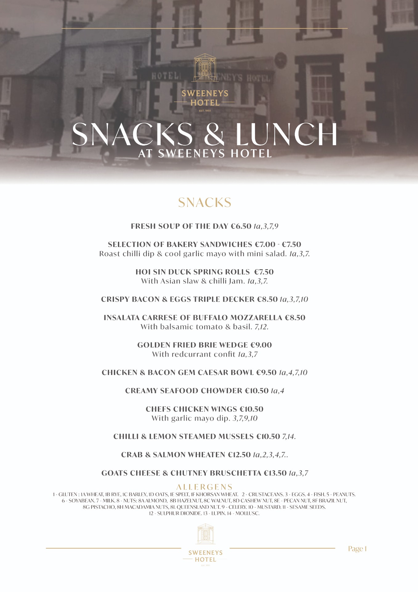 Available daily from 12:20pm to 5, our Snacks & Lunch Menu, offers comforting favourites & lighter bites, perfect for a casual midday meal. Menu also available in PJ's Saloon Bar & the Courtyard at Sweeneys.